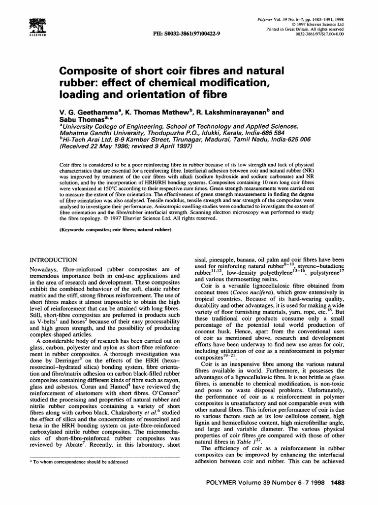 Composite Of Short Coir Fibres And Natural Rubber Effect Of Chemical Modification Loading And Orientation Of Fibre Composite Material Fibers